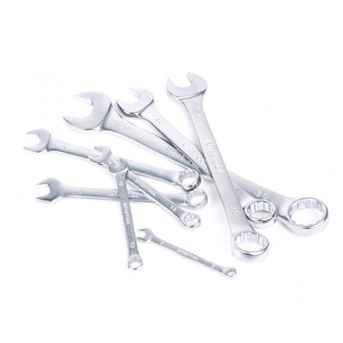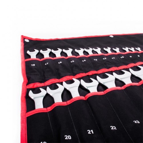 INTERTOOL HT-1200 — это набор из 25 комбинированных ключей, каждый из которых представляет собой сочетание рожкового и накидного гаечного ключа. Размерная линейка набора — 6; 7; 8; 9; 10; 11; 12; 13; 14; 15; 16; 17; 18; 19; 20; 21; 22; 23; 24; 25; 26; 27; 28; 30 и 32 мм. Обе стороны ключей имеют одинаковый размер головки. Широкий выбор размеров позволит подобрать наиболее удобный вариант в каждом конкретном случае. Ключи изготовлены из хром-ванадиевой стали. Её физические и химические свойства обуславливают высокую устойчивость к механическим нагрузкам, коррозионную стойкость и твердость. Кроме того, эта легированная сталь обладает благоприятным модулем упругости. Удобная форма и изгиб рукоятки ключа обеспечивают оптимальные условия для приложения усилия, благодаря чему легко можно закрутить/открутить крепежный элемент. Ключи поставляются в удобном сворачивающемся чехле с кармашками под ключ каждого размера.