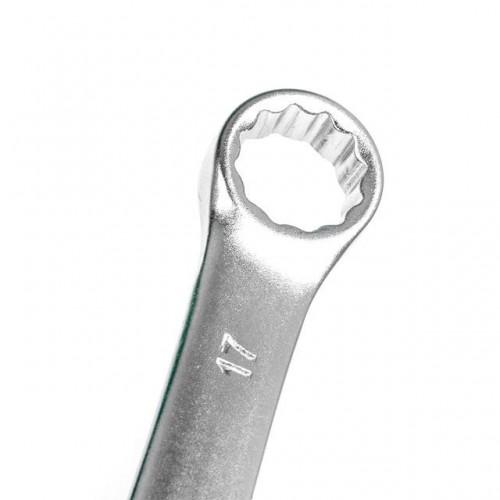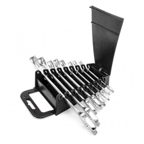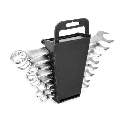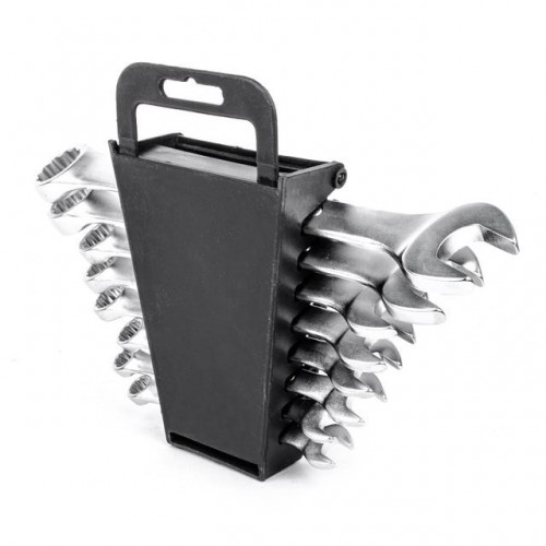 INTERTOOL HT-1202 — это набор из 8 комбинированных ключей, каждый из которых представляет собой сочетание рожкового и накидного гаечного ключа. Размерная линейка набора — от 8; 9; 10; 12; 13; 14; 17; 19 мм. Обе стороны ключей имеют одинаковый размер головки. Рожковая сторона ключей является самой популярной среди соединений и имеет обширную область применения. Накидная сторона ключей, благодаря кольцевому строению, в момент приложения усилия позволяет распределить нагрузку равномерно, что в свою очередь, снижает риск «слизать» грань угла. Ключи изготовлены из хром-ванадиевой стали. Её физические и химические свойства обуславливают высокую устойчивость к механическим нагрузкам, коррозионную стойкость и твердость. Кроме того, эта легированная сталь обладает благоприятным модулем упругости. Удобная форма ключа обеспечивает оптимальные условия для приложения усилия. Ключи поставляются в удобном пластиковом держателе с ручкой и отверстием для подвешивания.