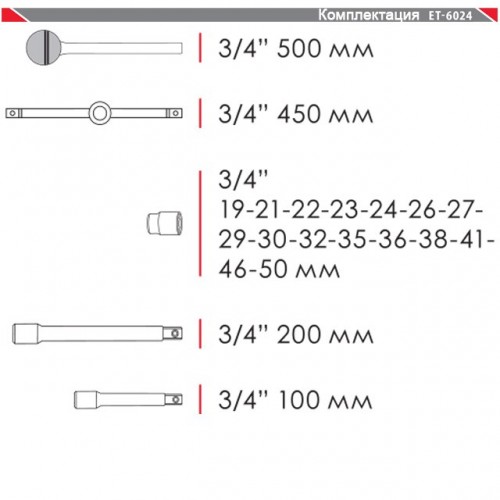Профессиональный набор инструмента INTERTOOL ET-6024 предназначен для использования в мастерских и автосервисах для ремонта грузовых автомобилей и другой тяжелой техники. В состав данного набора входит 20 единиц инструментов, в том числе 16 торцевых головок диаметром от 19 до 50 мм. Также в набор вошли трещотка, вороток с плавающей головкой и два переходника. Используемый в INTERTOOL ET-6024 размер квадрата – 3/4". Все инструменты изготовлены из хром-ванадиевой стали исключительно высокого качества, а также имеют специальное антикоррозийное покрытие. Профессиональный набор инструмента INTERTOOL ET-6024 поставляется в металлическом кейсе красного цвета с удобной ручкой и надежным замком.