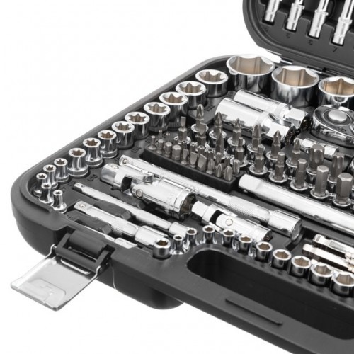 Набор из 156 единиц инструмента станет надежны помощником в быту и в мастерской. Основой набора являются три трещоточные рукоятки, с посадочными квадратам: 1/2", 3/8", 1/4", а также шестигранные головки размером от 4 до 32 мм.