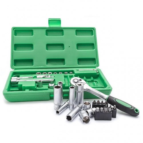 Набор инструментов INTERTOOL ET-6036 включает в себя 36 единиц и укомплектован в эргономичный кейс из ударопрочного пластика. В состав данного набора входит 10 торцевых головок диаметром от 4 до 13 мм, 1 ключ с трещоткой, 3 шестигранных Г-образных ключа, карданчик и переходники. Используемый размер квадрата – 1/4". Инструменты изготовлены из инструментальной высокоуглеродичтой закаленной стали. Кроме того, стоит отметить наличие антикоррозийного покрытия, также продлевающего срок службы инструмента.