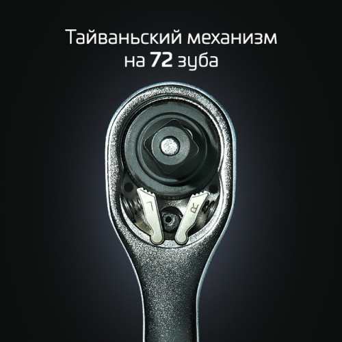 - Надежная трещоточная рукоятка. Механизм трещотки и все его комплектующие изготовлены в Тайване, в сочетании с Cr-V сталью - это прочный и надежный инструмент, с мягким ходом храпового механизма.