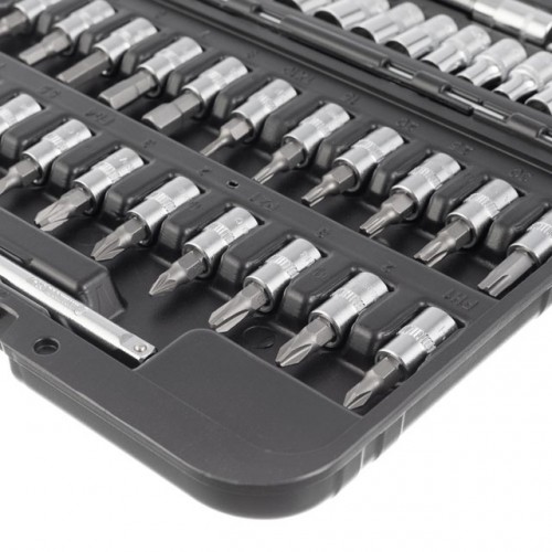 В комплекте самые популярные размеры торцевых головок, а также кардан, Т-образный вороток и гибкий удлинитель для откручивания и закручивания крепежей в труднодоступных местах. Различные типы бит пригодятся для работы со шлицами, которые часто используют в мебельной промышленности, в приборостроении и пр.