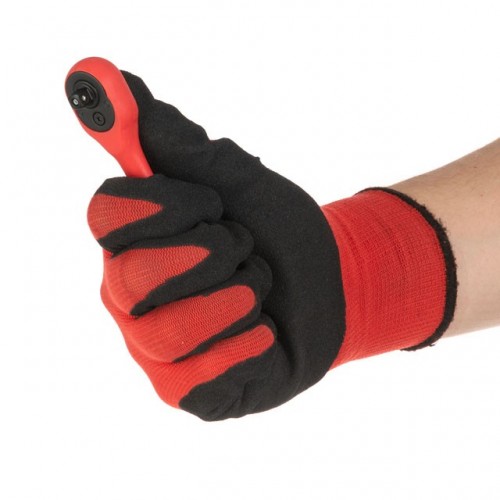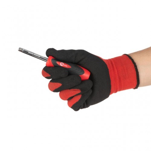 Небольшой изгиб рукоятки увеличивает комфорт при работе с неудобно расположенными крепежами. Трещотка полностью покрыта защитным слоем полипропилена с резиновыми вставками на ручке для прочной фиксации инструмент в руке, даже при попадании смазки или мазута. Рукоятка хорошо очищается от грязи при помощи ткани.