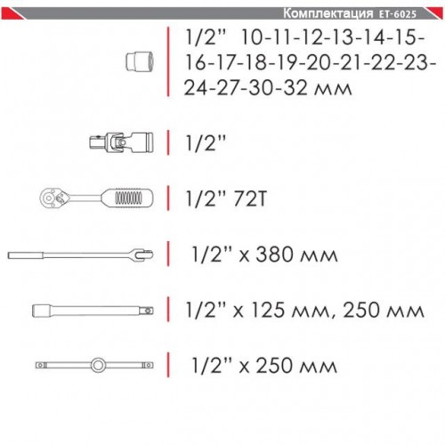 Профессиональный набор инструмента 1/2", 25 ед (гол. 10-32 мм) INTERTOOL ET-6025