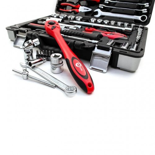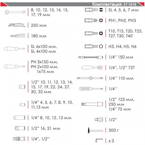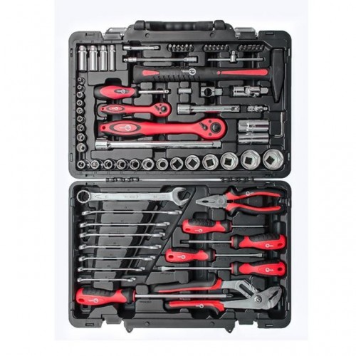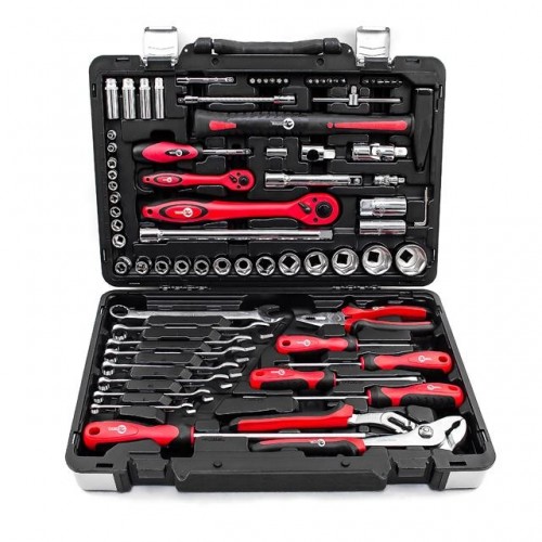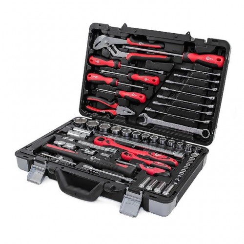 Набор инструментов ET-7078 ТМ INTERTOOL состоит из 78 единиц с рабочими квадратами 1/2" и 1/4". Благодаря своей универсальности он отлично подойдет не только для ремонта авто, но и для ремонтных работ по дому. Ведь в него входят: 8 рожково-накидных ключей, набор отверток, торцевые и свечные головки, переходники, воротки, отверточные биты, гибкий удлинитель, пассатижи, клещи сантехнические, шестигранные Г-образные ключи, молоток с ручкой из фибергласса, а также трещотка на 72 зубца с возможностью сброса и фиксации торцевых головок.
