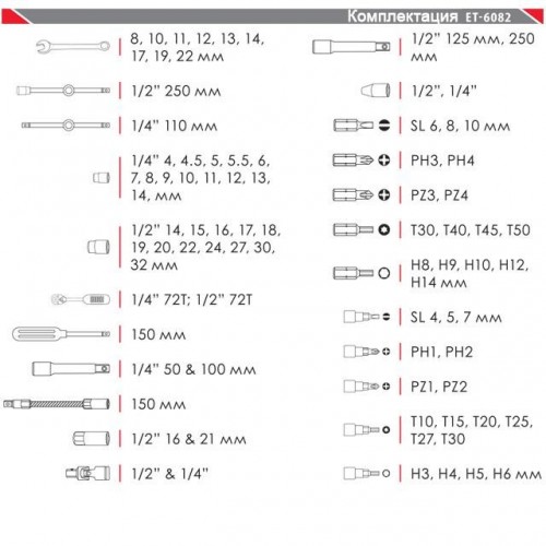 Профессиональный набор инструментов ET-6082 TM INTERTOOL — это оптимальная и хорошо продуманная комплектация из 82 единиц с рабочими квадратами 1/2" и 1/4". Все насадки и большинство инструментов изготовлены из высокопро... Читать далее...