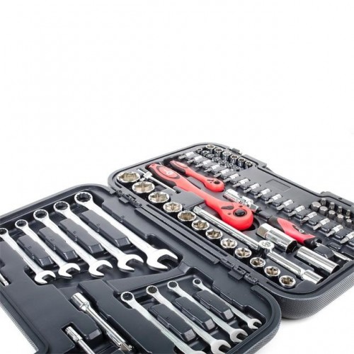 В состав данного набора входят 9 рожково-накидных ключей диаметром от 8 до 22 мм. Данные ключи сочетают в себе преимущества рожковых и накидных моделей, имеют сбалансированную рукоятку и могут быть использованы в труднодоступных местах. Кроме того, в профессиональный набор вошли 25 торцевых головок диаметром от 4 до 32 мм, 2 свечные головки, 2 воротка, 33 отверточных биты, переходники, карданчики и масса других полезных мелочей. Отдельного внимания заслуживают трещотки на 72 зубца с возможностью сброса и фиксации торцевых головок, которые помимо этого, покрыты защитным слоем из полипропилена, полностью исключающего возможность появления коррозии. Они отличаются прочностью и крайне легким весом, так как тоже изготавливаются из хром-ванадиумной стали.