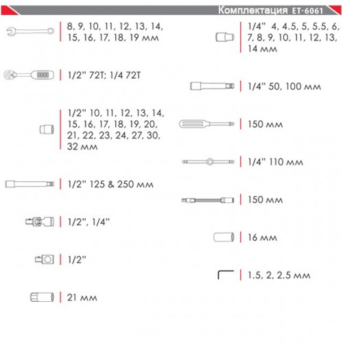 Профессиональный набор инструментов ET-6061 TM INTERTOOL незаменим при ремонте автомобиля или в работе по дому. Состоит из 61 единицы с рабочими квадратами 1/2" и 1/4". Обеспечивает наилучшие условия для приложения рабоч... Читать далее...