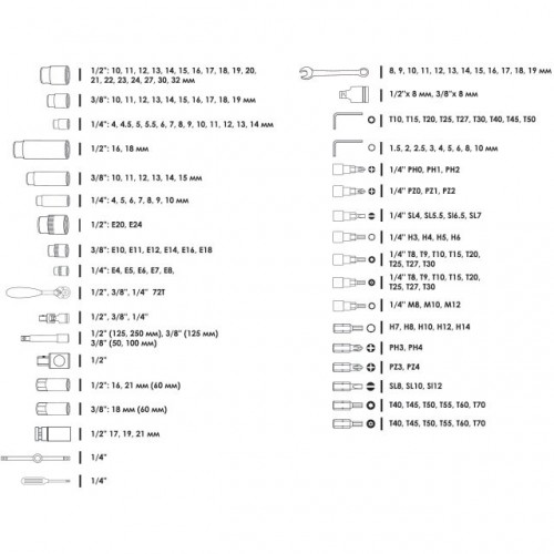 В наборе представлено огромное количество торцевых головок, отверточных бит, шестигранных и рожково-накидных ключей. Помимо этого, в нем есть свечные головки, воротки, переходники, удлинители, карданчики, а также три ультралегких трещотки на 72 зубца с возможностью сброса и фиксации торцевых головок. Эти рукоятки полностью покрыты защитным слоем из полипропилена, что исключает возможность появления коррозии. Все это делает набор ET-7176 универсальным и позволяет осуществлять ремонт практически любой сложности. Набор размещен в надежном кейсе из ударопрочного пластика с укрепленными металлом уголками и металлическими замками. Небольшие габариты набора, позволяют хранить его как в гараже, так и дома.