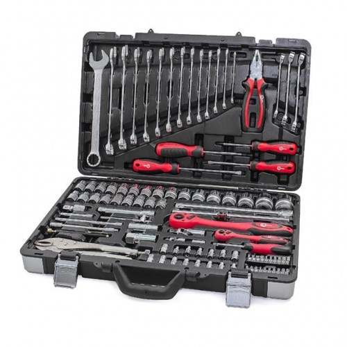 Практически все инструменты набора изготовлены из высококачественной хром-ванадиумной стали, что обеспечивает им долгий срок эффективной эксплуатации. Двухкомпонентные рукоятки удобно лежат в руке и не скользят. Отдельного внимания заслуживают ультра-легкие трещотки на 72 зубца с возможностью сброса и фиксации торцевых головок. Эти рукоятки полностью покрыты защитным слоем из полипропилена, что исключает возможность появления коррозии. Набор размещен в надежном кейсе из ударопрочного пластика с укрепленными металлом уголками и металлическими замками.