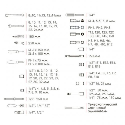 Набор инструментов INTERTOOL ET-7101 — это незаменимый инструментарий, который пригодится не только при обслуживании автомобиля, но и для ремонтных работ по дому. Он состоит из 101 единицы с рабочими квадратами 1/2" и 1/4". В набор входят большое количество рожково-накидных ключей, отверток и отверточных бит, торцевых и свечных головок, шарнирные воротки и воротки с плавающей головкой, переходники и удлинители, в том числе и гибкие, карданчики, пассатижи, зажимные клещи и другие полезные мелочи.