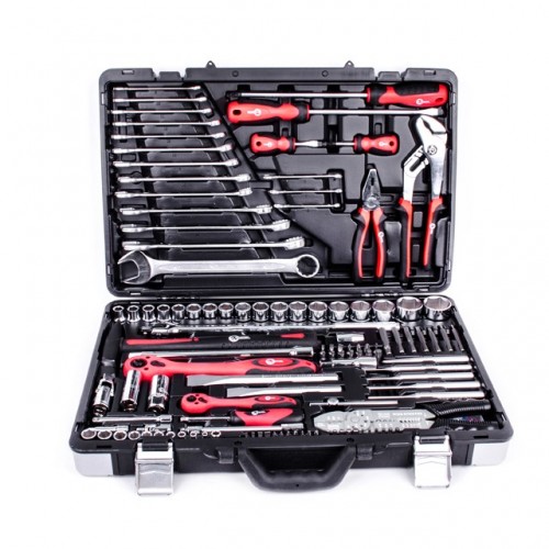 Набор укомплектован в удобный пластиковый кейс с металлическими замками и укрепленный металлическими уголками. Наличие большого набора ключей, торцевых головок, отверточных бит делает набор максимально универсальным и позволяет выполнять разноплановые задачи. Благодаря строгому соблюдению технологии производства, весь инструмент характеризуются высоким качеством и точностью.