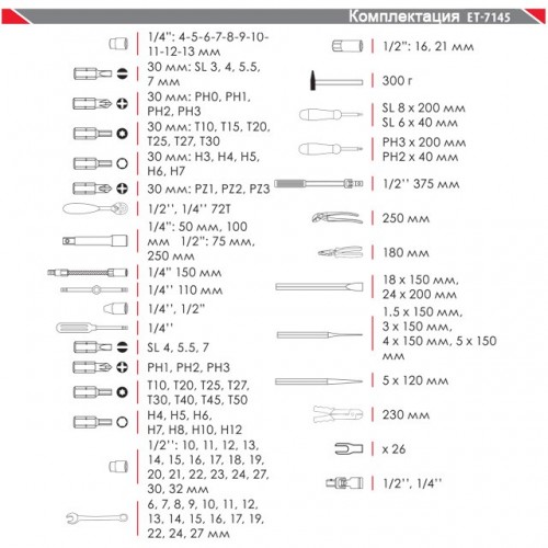 Набор инструментов ET-7145 TM INTERTOOL оптимален как для работы на СТО, так и для пользования в вашем гараже. Состоит из 145 единиц с рабочими квадратами 1/2" и 1/4". Практически все инструменты и насадки изготовлены из высокопрочного хром-ванадиевого сплава, что обеспечивает высокие эксплуатационные характеристики, а также защиту от коррозии. Прорезиненные двухкомпонентные рукоятки изделий удобно сидят в руке и не скользят. Отдельного внимания заслуживает рукоятка с храповым механизмом (трещотка) на 72 зубца с возможностью сброса и фиксации торцевых головок. Она также изготовлена из хром-ванадиумной стали и при этом покрыта защитным слоем из полипропилена, полностью предотвращающим возможность появления коррозии.