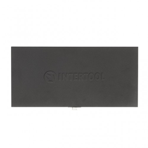 Весь набор помещен в прочный металлический кейс, который закрывается защелку из металла. Удобно транспортировать и хранить набор, все насадки размещены в персональных пронумерованных ячейках - вы быстро найдете необходимую биту.