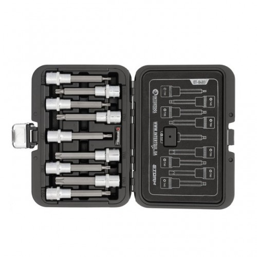 Набор насадок TORX в держателе предназначен для монтажа и демонтажа крепежей с типом шлица: T20, T25, T27, T30, T40, T45, T50, T55, T60. Данный комплект сменных бит подходит для использования совместно с трещоточными рукоятками и держателями, с посадочным квадратом 1/2". Удлиненные биты 100 мм позволяют эффективно работать в труднодоступных местах и гарантируют надежное сцепление со шлицом крепежа.