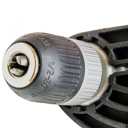 Кнопка пуска нажимается очень легко и плавно. Над ней расположен переключатель функции реверса. В данной модели предусмотрена регулировка количества оборотов. Это реализовано наличием колесика на кнопке пуска. Для сверления глубоких отверстий при продолжительных непрерывных работах возле кнопки пуска имеется фиксатор кнопки пуска. Нужно полностью нажать кнопку пуска, а после зафиксировать ее нажатием кнопкой фиксации. Чтобы снять фиксацию, достаточно просто еще раз нажать на кнопку пуска.