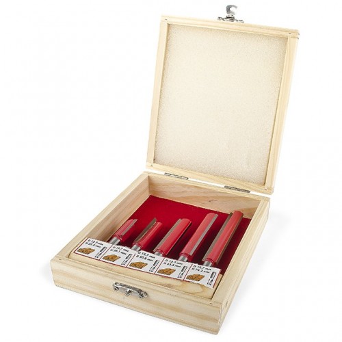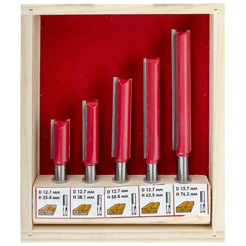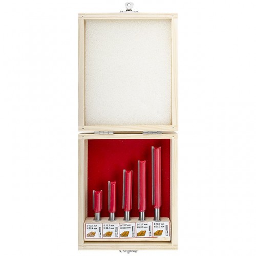 В наборе HT-0075 представлены 5 фрез разной длины. Это прямые пазовые фрезы, которые предназначены для изготовления прямых пазов различной ширины и глубины, а также для сквозного отверстия. Прямые пазовые фрезы как в наборе HT-0075 используются для прорезания шпоночных отверстий для дверей или для окон. Также, эти фрезы используются для двойного шпунтового соединения, шипового потайного или полупотайного соединения и др. Все фрезы укомплектованы в специальный деревянный кейс, который удобен как для хранения, так и для транспортировки.