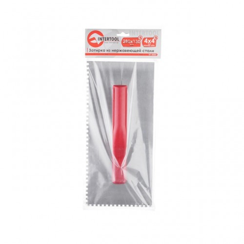 Затирка из нержавеющей стали KT-0004 INTERTOOL с квадратным зубом 4*4 мм. Габаритные размеры – 280*130 мм. Эргономичная пластиковая ручка надежно закреплена у основания полотна. Предназначена для равномерного нанесения и распределения различных строительных смесей по поверхности. Небольшой вес придает удобство и комфорт в работе.