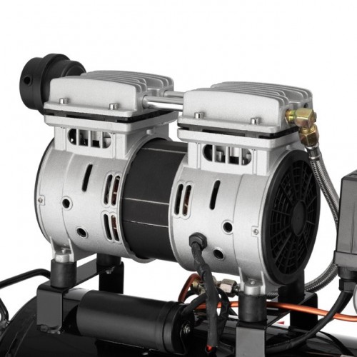 Это достигается тем, что кольцо поршня изготовлено из самосмазывающегося материала с очень низким коэффициентом трения. При своей производительности и наличии двух цилиндров компрессор имеет очень низкое энергопотребление. Мощность электродвигателя составляет 1100 Вт. Производительность компрессора составляет 145 л/мин, а рабочее давление 8 атм. На ресивере установлен блок автоматики компрессора: измеритель, регулятор давления, выпускной клапан и два манометра. С помощью регулировочного винта можно задавать необходимое давление на выходе.