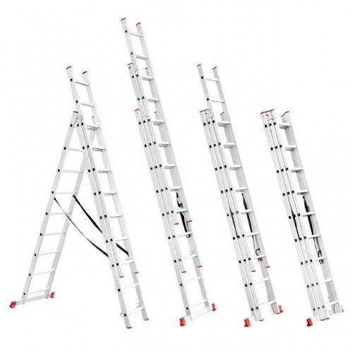 Универсальная алюминиевая 3-х секционная раскладная лестница LT-0309 ТМ INTERTOOL незаменима как в строительстве так и в быту. Лестница LT-0309 изготовлена из высококачественного экструдированного алюминиевого профиля, соответствует европейскому стандарту EN131. При весе 13,7 кг выдерживает нагрузку до 150 кг. Каждая из 3-х секций оснащена 9 рифлеными ступенями шириной 280 мм. Высота в разложенном виде 5926 мм, в сложенном 2566 мм. Противоскользящие опорные заглушки обеспечивают надежное сцепление с опорной поверхностью, препятствуют скольжению. Может применяться как приставная, выдвижная лестница и свободностоящая стремянка. Атмосферостойкие ленты предотвращают самопроизвольное раздвижение боковин.