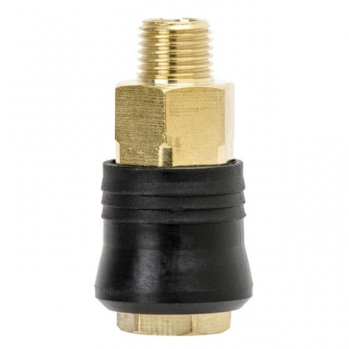 PT-1815 – быстроразъемная муфта с клапаном "мама" универсального типа, подходит для быстросъемных соединений "папа" любых видов. С другой стороны фитинг оснащен наружной дюймовой резьбой 1/4".