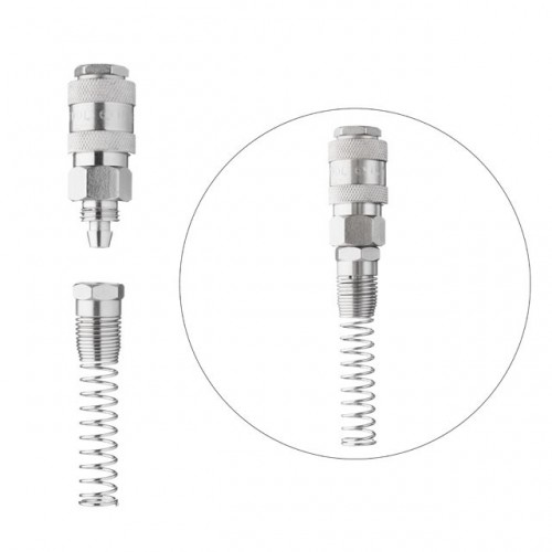 Быстросъемное соединение с пружиной INTERTOOL PT-1831 используется для установки на спиральные и прямые воздушные шланги, чтобы обеспечить быстрое подключение пневмоинструмента к компрессору или воздушной магистрали. Также их используют для ремонта шлангов с повреждениями и для заменены вышедших из строя коннекторов.