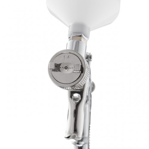 Краскопульт PT-0112 — отличный помощник в работе с ЛКМ средней вязкости. Данный пневматический краскопульт изготовлен по технологии НР (High Pressure). Его рабочее давление — до 5 Атм. Благодаря высокой скорости воздушного потока обеспечивается впечатляющая скорость покрытия поверхности. Он отлично справится с бытовыми покрасочными задачами и отлично зарекомендовал себя в работе с грунтовкой, лаками и морилкой. Несложная конструкция обуславливает простоту и эффективность в эксплуатации. Емкость пластикового бачка с верхним расположением — 600 мл. Диаметр форсунки — 1,4 мм. Факел распыления может быть плоским или овальным. Расход воздуха колеблется в рамках 130-190 л/мин.