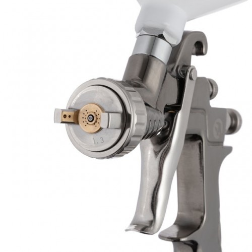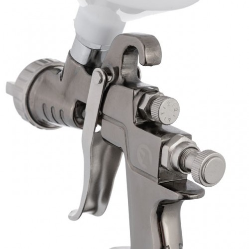 Краскопульт пневматический РТ-0138 создан по технологии LVLP, т.е. работает с низким давлением и небольшими объемами воздуха. Совокупность доступных режимов регулировки и уникальная форсунка, диаметром 1,3 мм позволяют добиться высококачественного покрытия при максимальной экономии лакокрасочных материалов за счет более равномерного факела и снижения уровня перераспыла. Благодаря этому коэффициент переноса ЛКМ на поверхность составляет 92%. Бачок изготовлен из пластика и имеет верхнее расположение, что обеспечивает удобство работы и равномерную подачу ЛКМ. Его емкость — 600 мл. При рабочем давлении до 2 Атм, расход воздуха колеблется от 170 до 200 л/мин. Краскопульт имеет надежную и прочную конструкцию, с ним легко и удобно выполнять любые покрасочные работы.