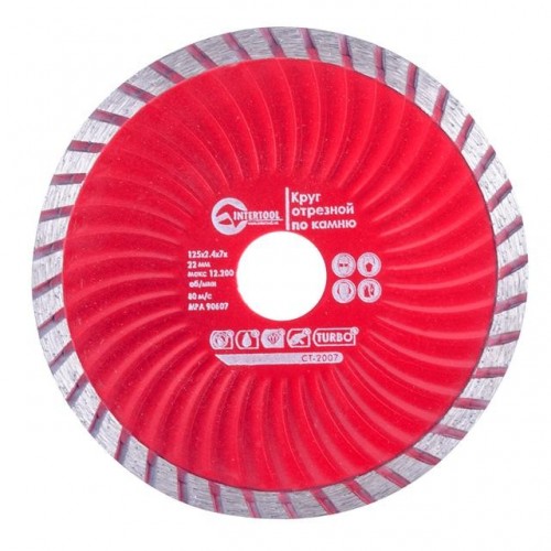 Алмазный отрезной диск TURBO INTERTOOL CT-2007 диаметром 125 мм предназначен для использования c угловыми шлифмашинами с высокой скоростью вращения, а также с бензиновыми резчиками и ручными отрезными машинами. Преимуществом алмазных дисков класса TURBO является более высокая скорость резки при работах с камнем, кирпичом и бетоном. Наличие специальных каналов помогает быстро отводить пыль в процессе резки. Состав металла самого диска, а также непрерывный алмазоносный слой отрезного круга гофрирован, что позволяет выдерживать серьезную силовую и тепловую нагрузку, и дает возможность осуществлять работы по резке бетона и кирпича сухим способом, не охлаждая алмазный турбо-диск. Также их можно использовать и для мокрого типа резки. Насыщенность алмазной крошкой — от 22 до 24%.