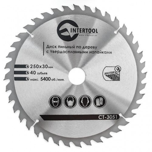Диск пильный по дереву с твердосплавными напайками 250x30x1,7 мм , 40 зубьев INTERTOOL CT-3051