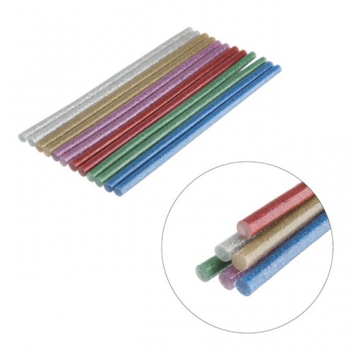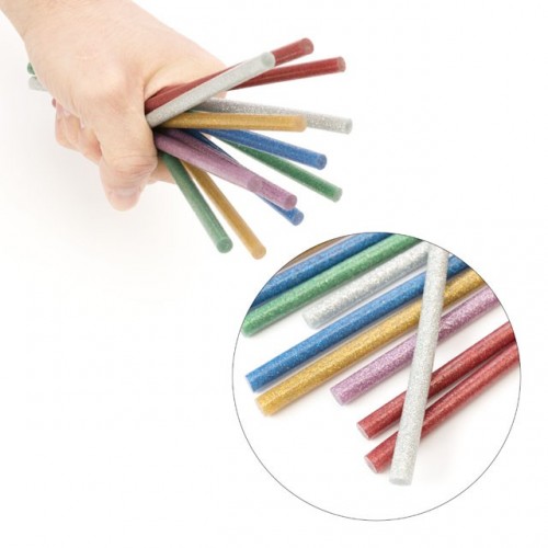 Цветные клеевые стержни с блестками, изготовлены из пластичного этиленвинилацетата, который безопасен для здоровья. В комплекте 6 цветов: серебро, золото, красный, сиреневый, зеленый, синий.