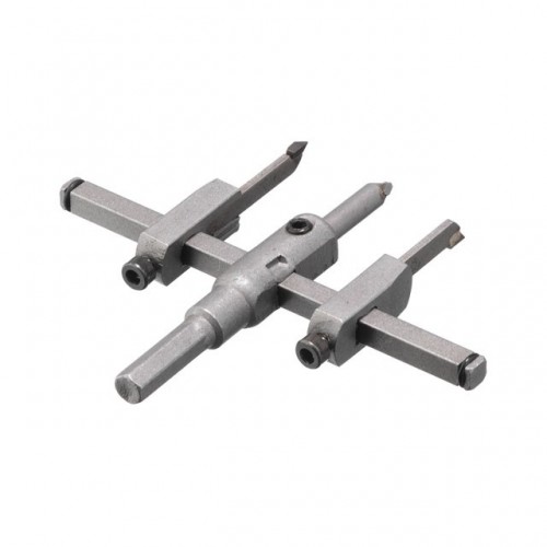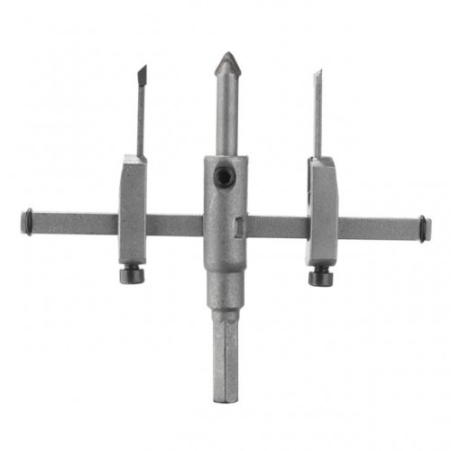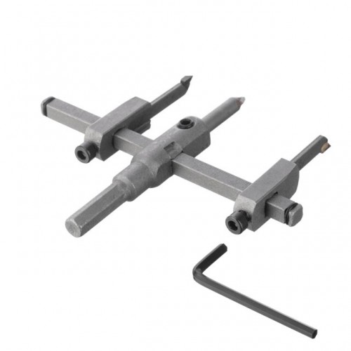 Двухрезцовая система с центрирующей частью компенсирует возможное биение и несимметричность конструкции, по сравнению со сверлами с одним резцом. Все режущие части кругового сверла оснащены твердосплавными кромками, которые обеспечивают качественный и ровный рез. С помощью специальных винтов и шестигранника Вы сможете легко отрегулировать расстояние между резцами и вырезать отверстия различных диаметров от 30 до 120 мм.