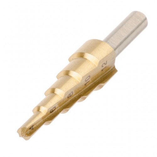Ступенчатое (шаговое) сверло – отличный помощник для деликатного сверления отверстий большого диаметра в листовых металлах и пластике. Ступенчатая структура позволяет сверлить отверстия разного диаметра (4-12 мм), без замены режущего инструмента. Цилиндрический хвостовик (6 мм) позволяет устанавливать сверло в дрель, шуруповёрт или сверлильный станок.