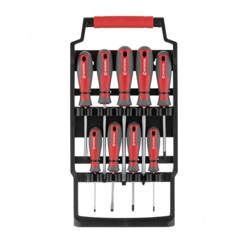 Отвертки укомплектованы в удобный держатель с ручкой, который фиксирует каждую отвертку и позволяет без труда транспортировать весь набор. Комплект также можно подвесить на стену, предусмотрены специальные отверстия для крепления.