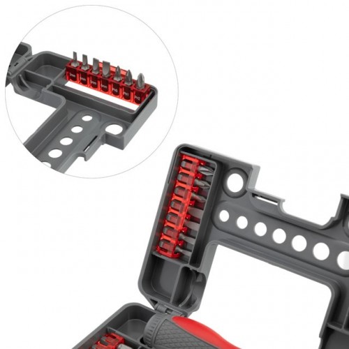 Продуманный и функциональный кейс-трансформерВесь набор размещен в компактном кейсе, где отвертка выступает в роли ручки. Это позволяет экономить пространство при хранении, а также удобно переносить комплект.