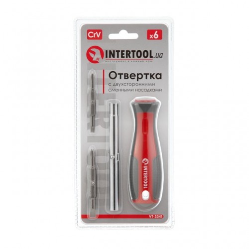 Отвертка с двухсторонними сменными насадками 6 в 1 (SL6.35*65мм, PH1*5мм, SL8.0*75мм, PH2*6мм, внутренний шестигранник 6мм, 8мм INTERTOOL VT-3341