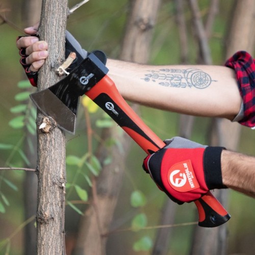 Топор компактного размера 365х150х20 мм, поэтому легко помещается в багажник машины. Силиконовая накладка на лезвие защищает от случайных порезов и повреждений. Красно-черный окрас топора помогает быстро его находить глазами, даже в густом лесу или в траве.