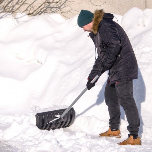 - Стальная кромка на лезвии лопаты значительно продлевает срок эксплуатации лопаты и защищает пластиковый ковш от сколов и трещин.