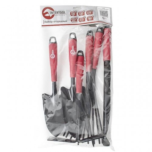 Набор огородный INTERTOOL FT-0020: лопата 330 мм, грабли 330 мм, грабли веерные 400 мм, сапка огородная 330 мм, культиватор 370 мм, а также удлинитель 780 мм к ним предназначены для всех основных видов садовых работ. Инструменты изготовлены из прочного металла со специальным покрытием, исключающим налипание земли на рабочую поверхность. Особая форма изгиба и заточки позволяет легко и эффективно обрабатывать землю. Рукоятки полой формы, выполнены из высокопрочного пластика и могут "наращиваться" за счет удлинителя, идущего в комплекте.
