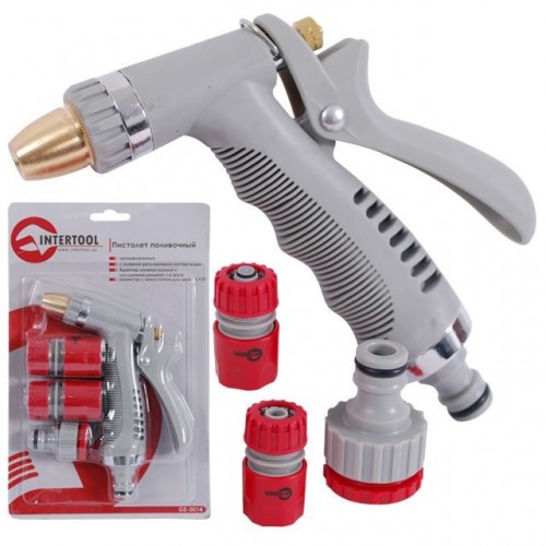 Пистолет-распылитель ТМ INTERTOOL GE-0014 имеет инновационный дизайн с элементами из хромированного метала и обладает эргономичной ручкой из мягкого пластика, предотвращающую выскальзывание во время работы. Оснащен 3-мя режимами полива с плавной регулировкой потока воды. В комплекте с адаптером универсальным с внутренней резьбой 1/2" и 3/4", коннектором 1/2" для шланга 1/2" и коннектором с аквастопом 1/2" для шланга 1/2" легко и надежно подключается к системе полива без использования дополнительных инструментов.