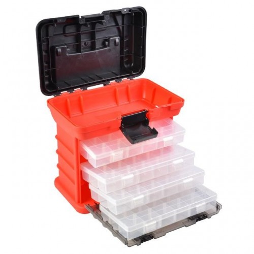Благодаря четырём выдвижным секциям его вместительность значительно увеличивается! Размер же ячеек можно регулировать, тем самым помещая различного типа и длиной болты, гвозди, саморезы, да и вообще, все что угодно. Идеальный вариант для подарка.