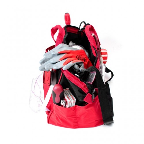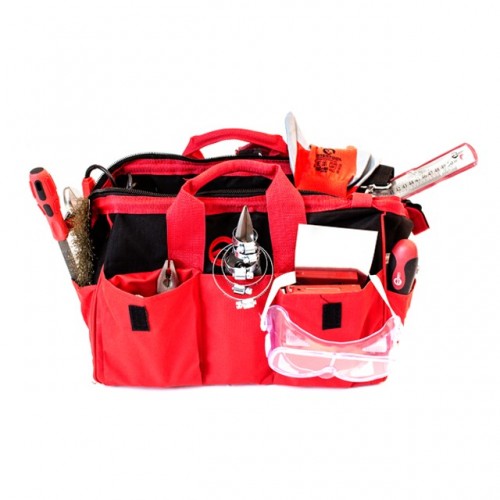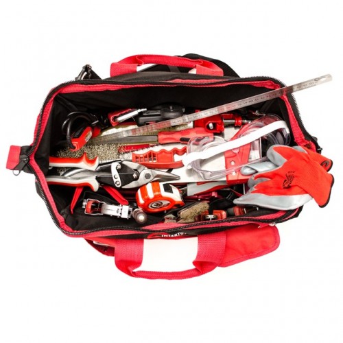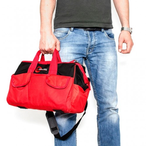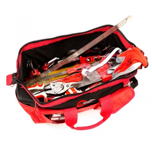 Красно-черная сумка изготовлена из прочного полиэстера (600 d), который способен выдерживать значительные нагрузки. Уплотненное дно и металлический каркас основного отдела позволяют ей постоянно сохранять свою форму. Всего сумка имеет 16 карманов, куда без труда помещаются все перечисленные инструменты.