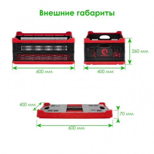 Конструкция ящика спроектирована в соответствии с типоразмером 600х400 мм. Ящики данного размера еще называют - евроконтейнер. Совместим со всеми другими складными и нескладными моделями данного размера с различной высотой, используемых для складской и транспортной логистики практически во всех сферах. Высота собранного ящика составляет 260 мм, разобранного 70 мм.